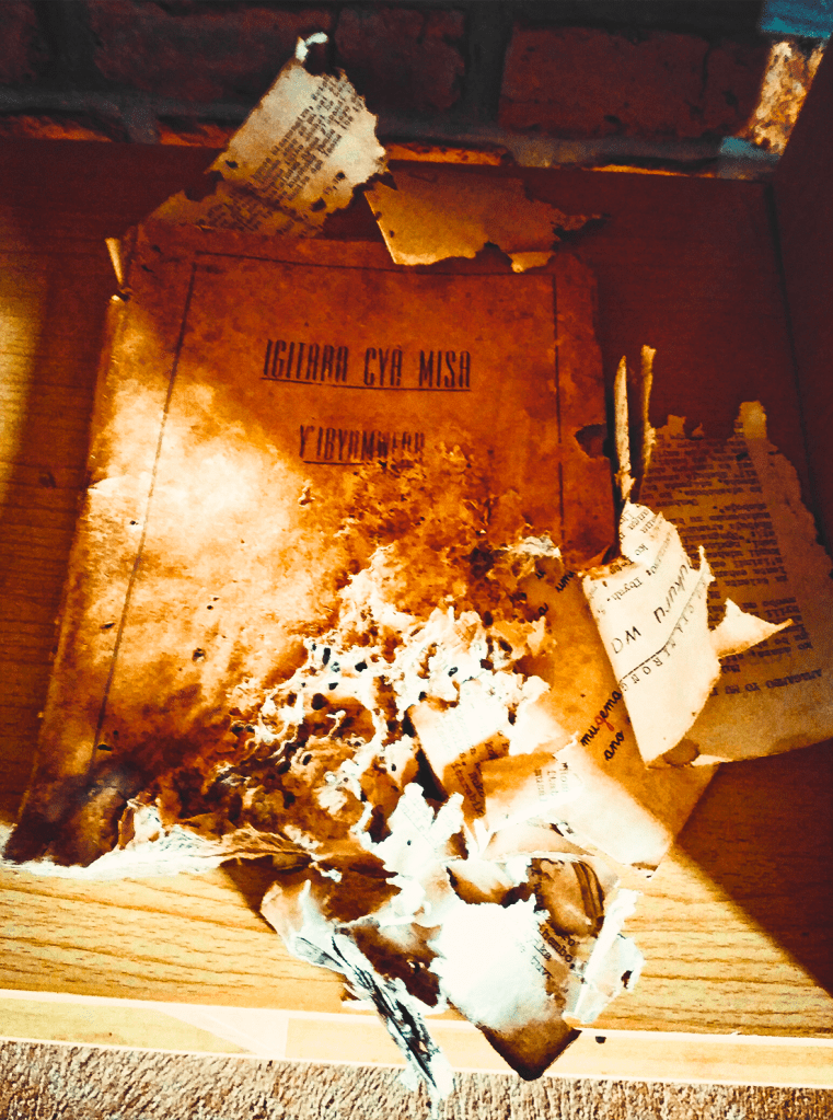 Everything is still there, almost all in place. The wooden pews the community people would sit on during mass; the hymn books in the vestry with bookmarks of the last responsorial psalm still in place; the children’s writing on the Sunday school blackboards, their young minds learning the tenets; and the blood on the walls after their young skulls were bashed in; their tiny dirty clothes, clothes that clung onto their frames until there was nothing but bone they could hold on to.