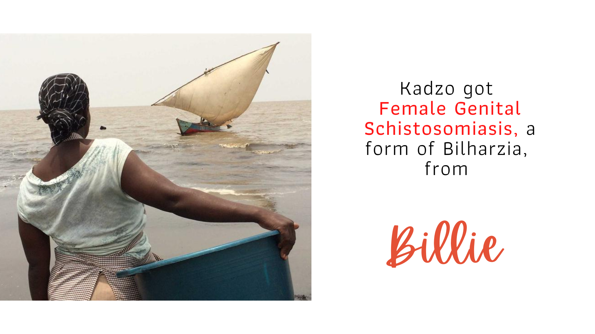 While researching Billie (schistosomiasis, bilharzia or snail fever) and its effects in Kenya, we encountered many different versions of Kadzo’s story. According to the World Health Organization (WHO), over 80% of schistosomiasis cases are found in sub-Saharan Africa. The organization has placed schistosomiasis as the third most devastating tropical disease, following malaria and intestinal helminthiasis. Schistosomiasis continues to seriously affect local communities in Kenya, with a particularly severe impact on women of child-bearing age who suffer considerably from female genital schistosomiasis that causes menstrual disorders, preterm labor, anemia, and infertility.