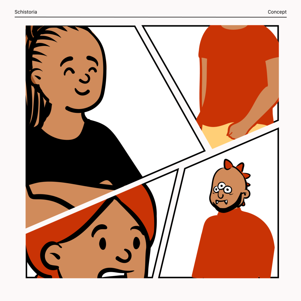 A comic strip representing the characterisation and action flow for Schistoria.